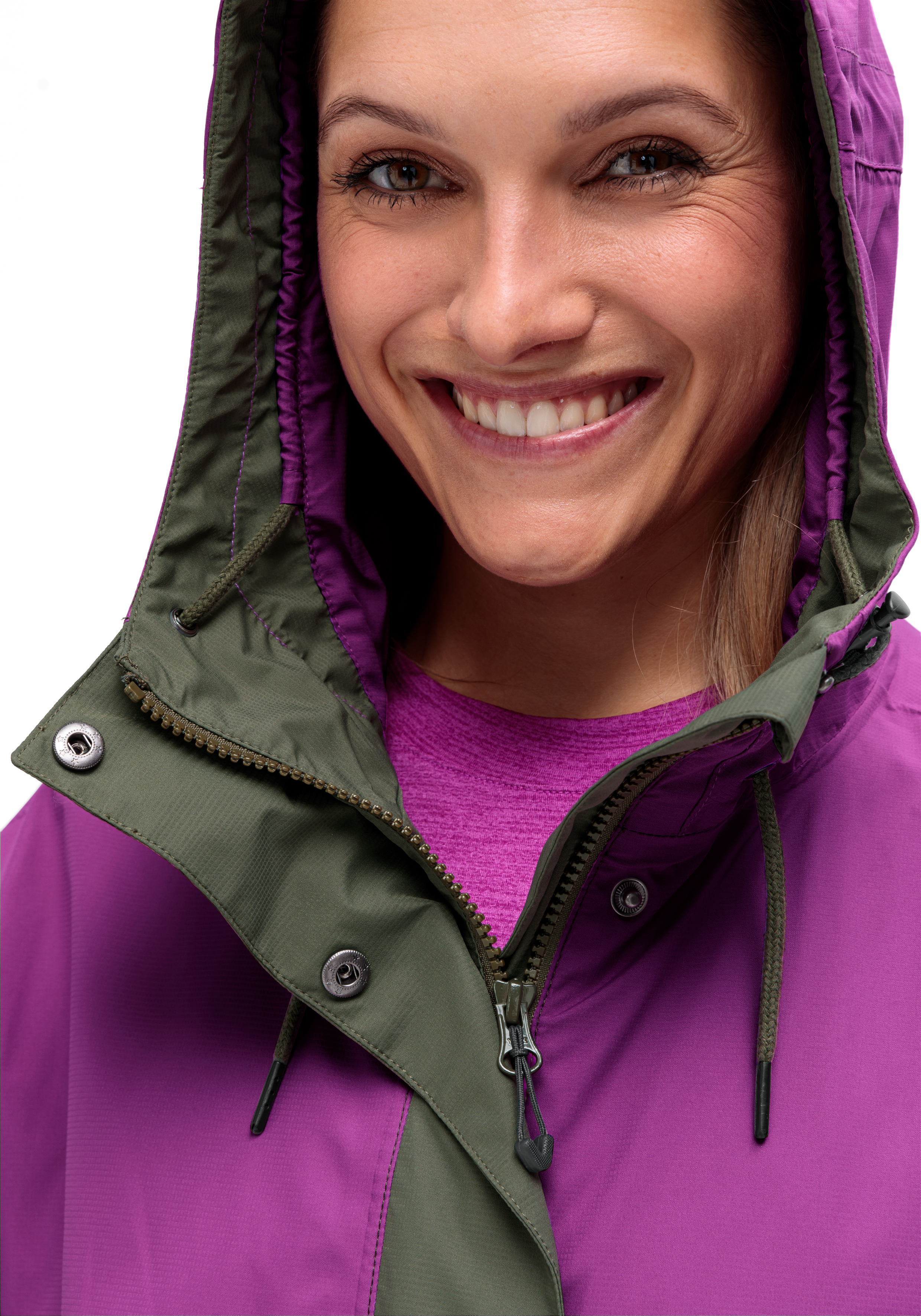 Die angeschnittene Kapuze lässt sich individuell anpassen, der Saum per Kordelzug regulieren. Zwei Reißverschlusstaschen außen und eine Innentasche bieten Platz für alles, was du unterwegs brauchst. Mit Gummiband am Armabschluss und einer lockeren Passform sitzt die Jacke bequem und macht jede Bewegung mit.